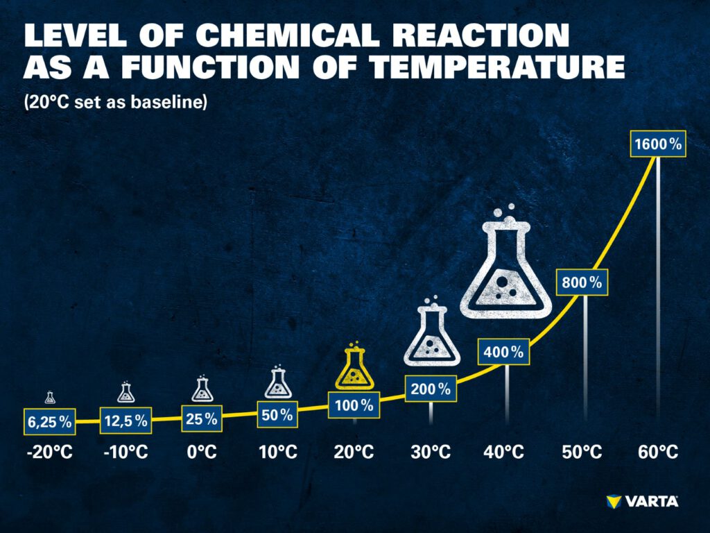 Volgens Varta, een grote producent van accu’s, werkt een accu het beste rond de 20 graden. Bij 10 graden is de capaciteit al gehalveerd en rond het vriespunt is het nog maar 10%. Als je accu dan al wat minder is, krijgt deze steeds meer moeite om genoeg stroom te leveren.